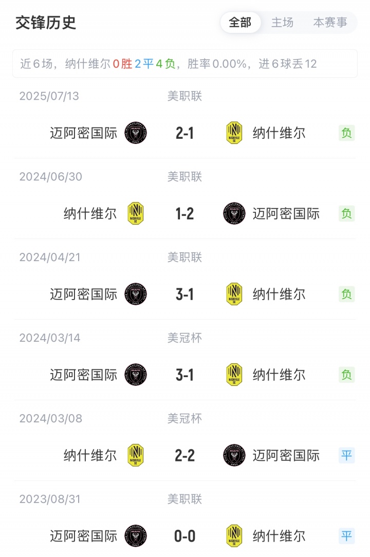 迈阿密国际联赛18胜8平7负积62分,近期收获2连胜;纳什维尔联赛16胜6平11负积54分,近2轮不败。迈阿密对阵纳什维尔已8场不败(5胜3平)。