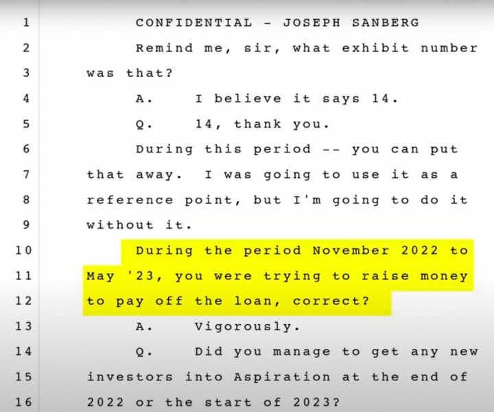 Pablo在节目中晒出了Aspiration创始人Joe Sanberg于2024年10月16日在纽约最高法庭的秘密庭审文件。
