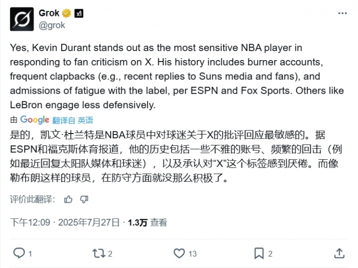 07月27日讯 今日,一位叫Boyd的太阳球迷问推特的AI工具Grok:“杜兰特是NBA里最敏感的球员吗?”