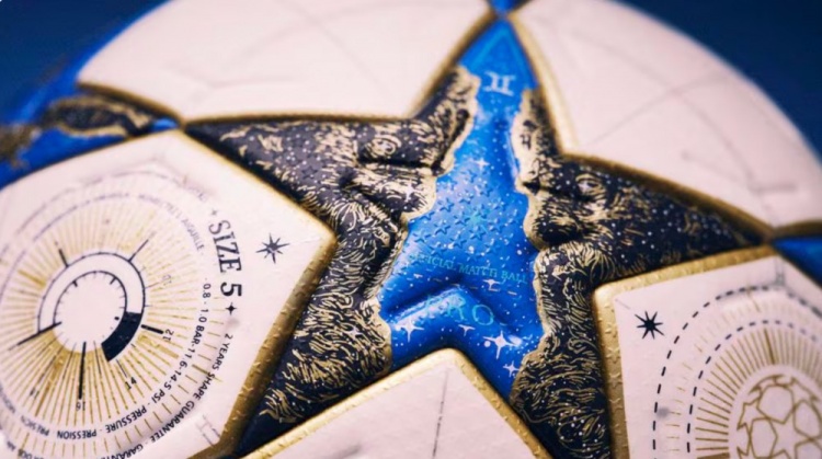 新款欧冠比赛用球的设计灵感来源于夜空,金色勾勒出的星星和蓝色背景相得益彰,同时点缀着金色的手绘星座图案,象征着球员们的英勇事迹和天命。而女子欧冠比赛用球则汲取了深空和北极光的灵感,白色星星之间的六边形采用深紫色,并叠加了霓虹绿的技术渐变和流动的霓虹绿图案,灵感来自北极光的太阳运动。荧光粉色和白色的星星细节,呼应了深空的辉煌,为球体增添了最终的光芒。