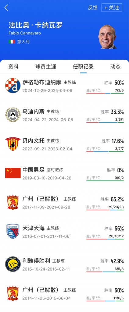 卡纳瓦罗还曾执教广州恒大,此后还曾回国先后执教贝内文托和乌迪内斯。